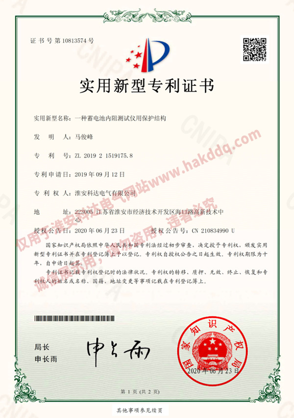 蓄電池內阻測試儀專(zhuān)利證書(shū)